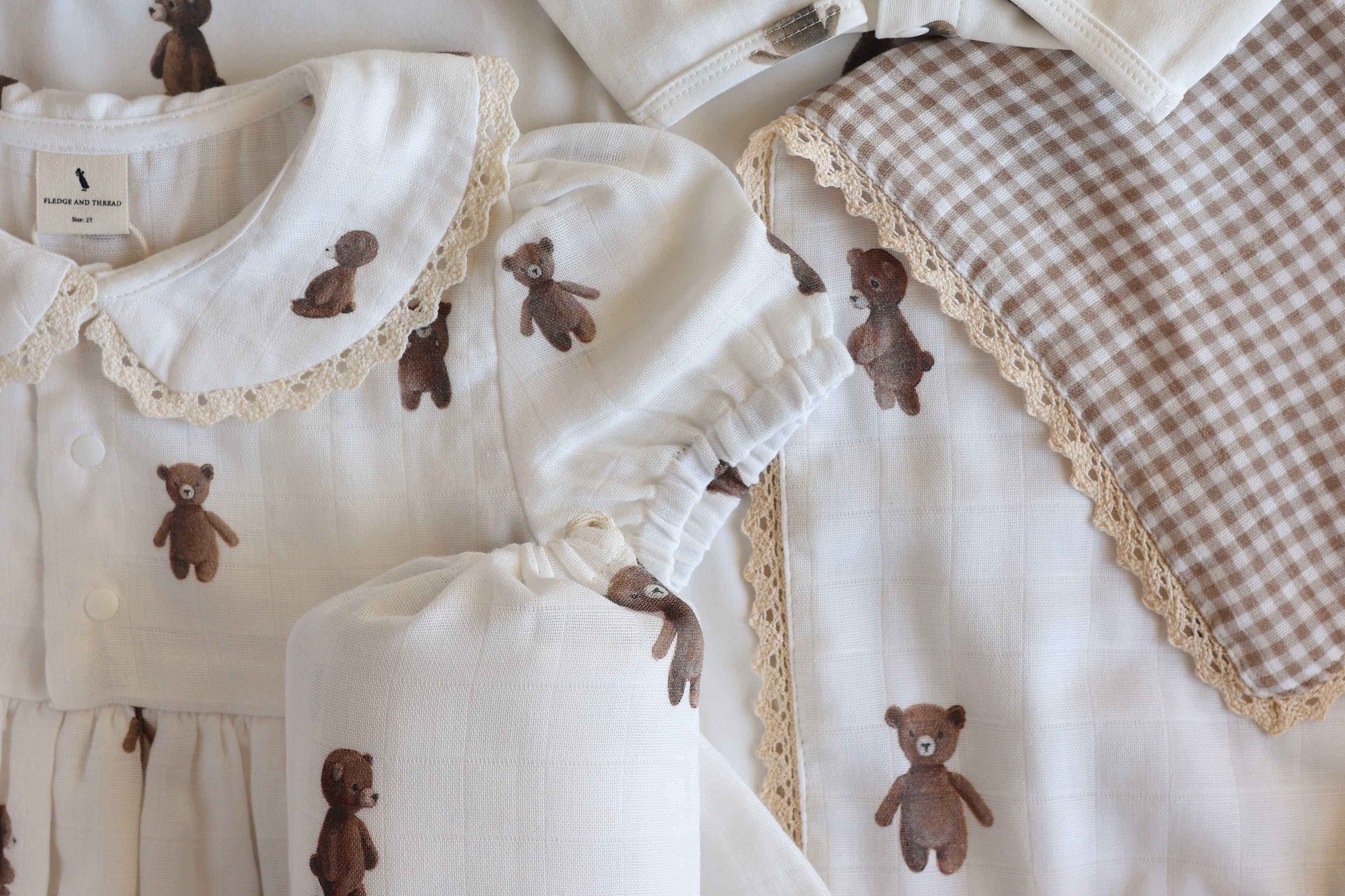 Our collection includes beautifully made baby grows, rompers, and bodysuits, all crafted from soft, breathable 100% cotton for everyday comfort. For gifting and special moments, explore our Baby Gift Boxes - complete sets featuring a bodysuit, beanie, and stretch wrap in matching teddy bear prints, thoughtfully packaged and ready to delight new parents.