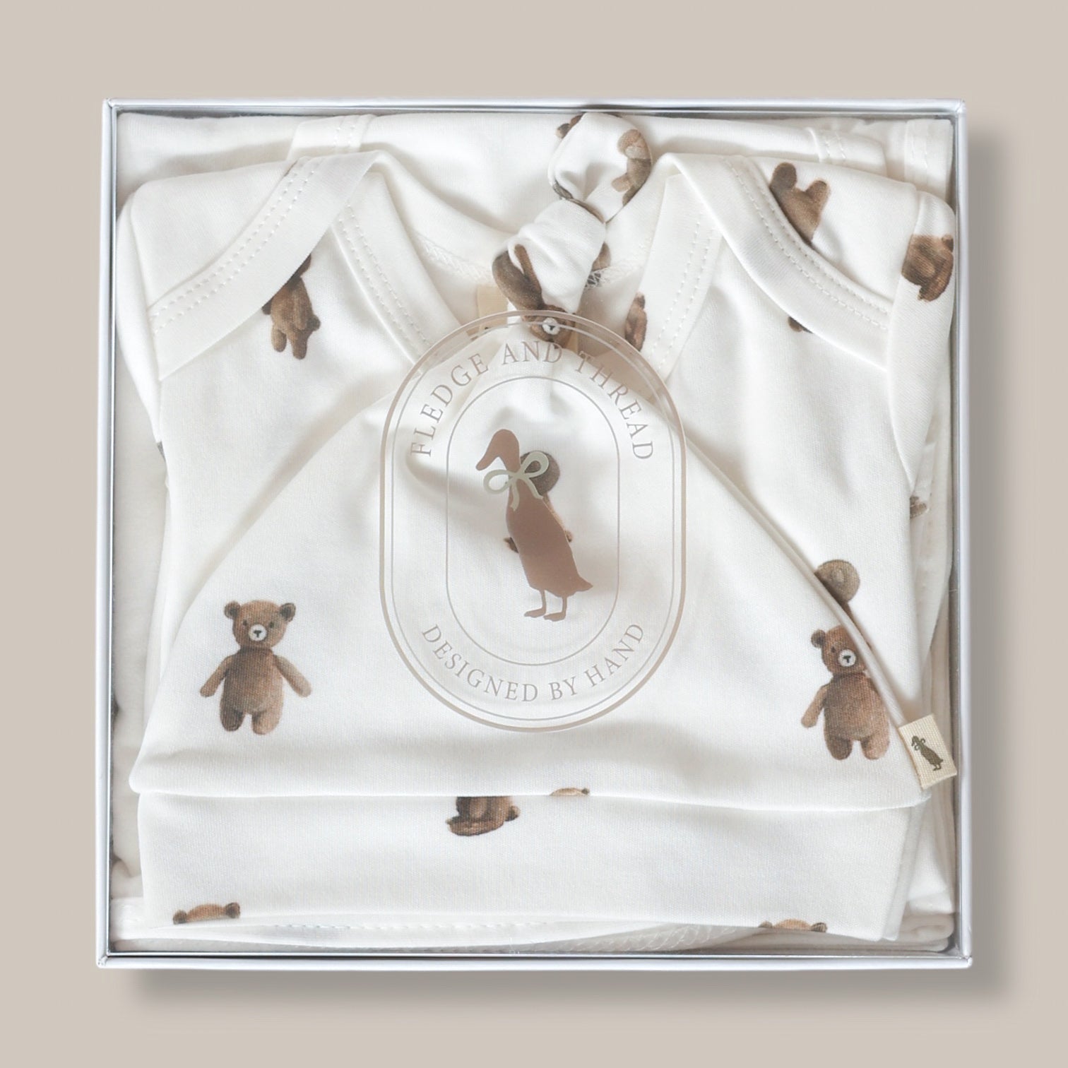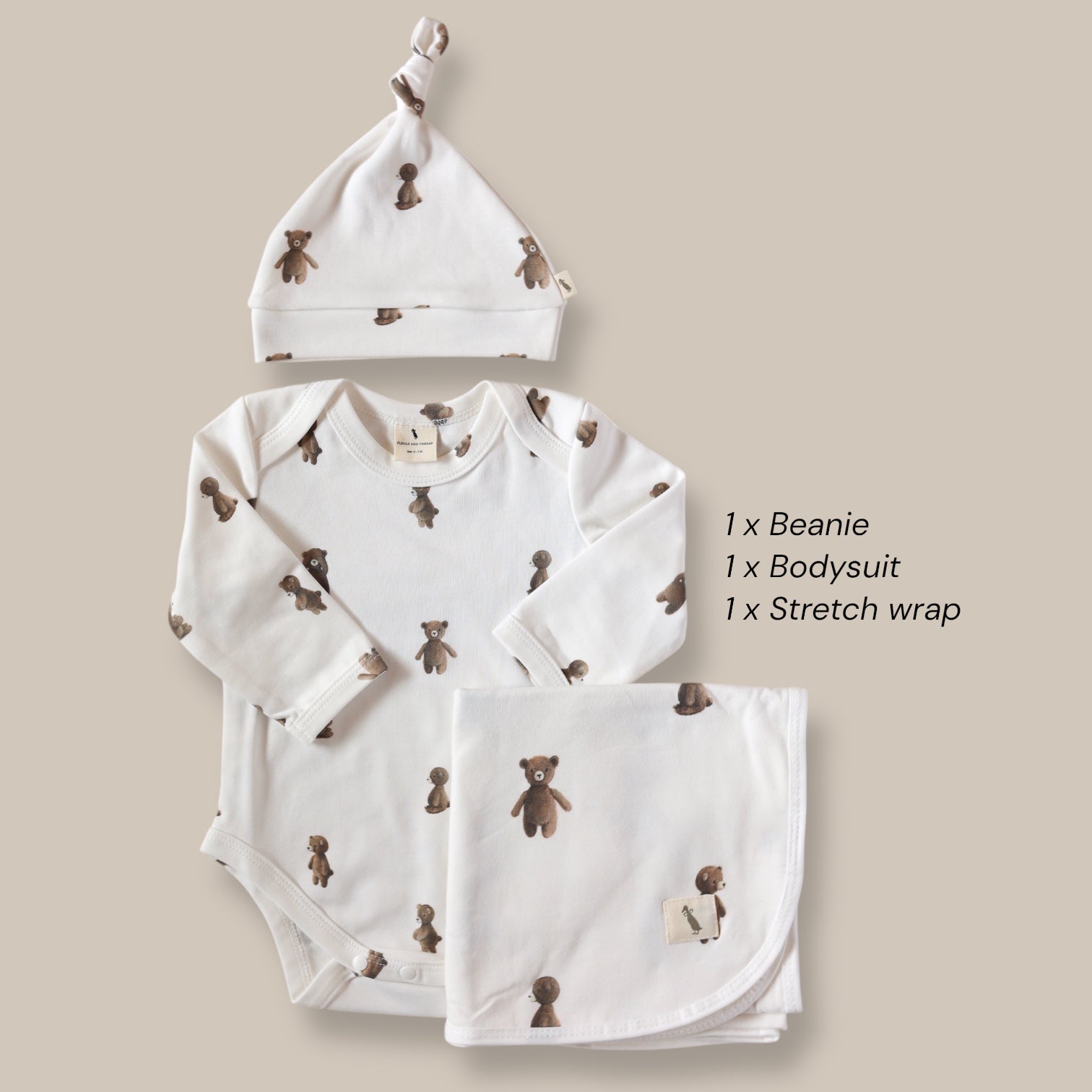 A soft stretch swaddle wrap, a 0–3 month bodysuit, and a matching beanie, all crafted from premium cotton and finished with our signature hand-illustrated designs.