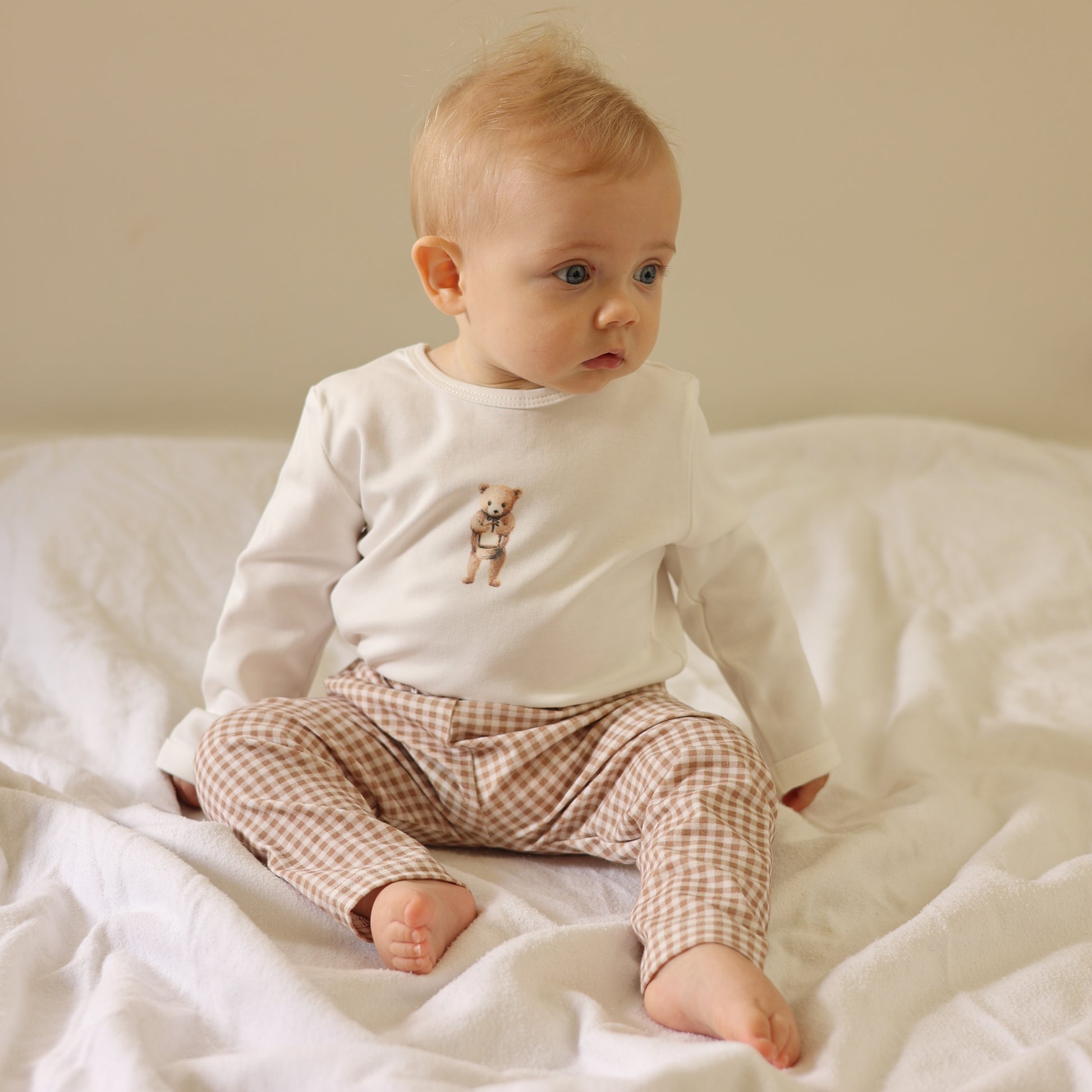 Pair your long sleeve top with matching gingham or striped pants for a complete outfit.
