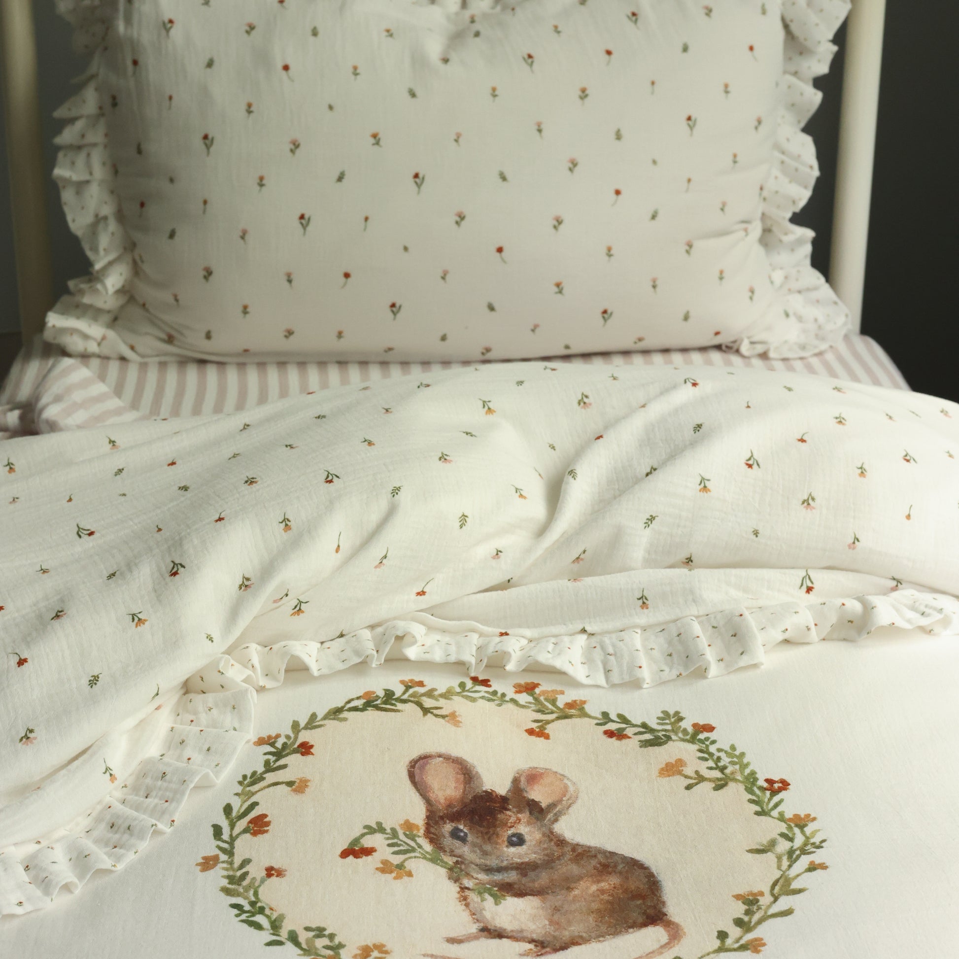 Our Mouse Quilt cover set is inspired by the simple joys of days gone by. The design was hand painted in Australia and made from 100% muslin cotton, soft and breathable for cozy nights.
