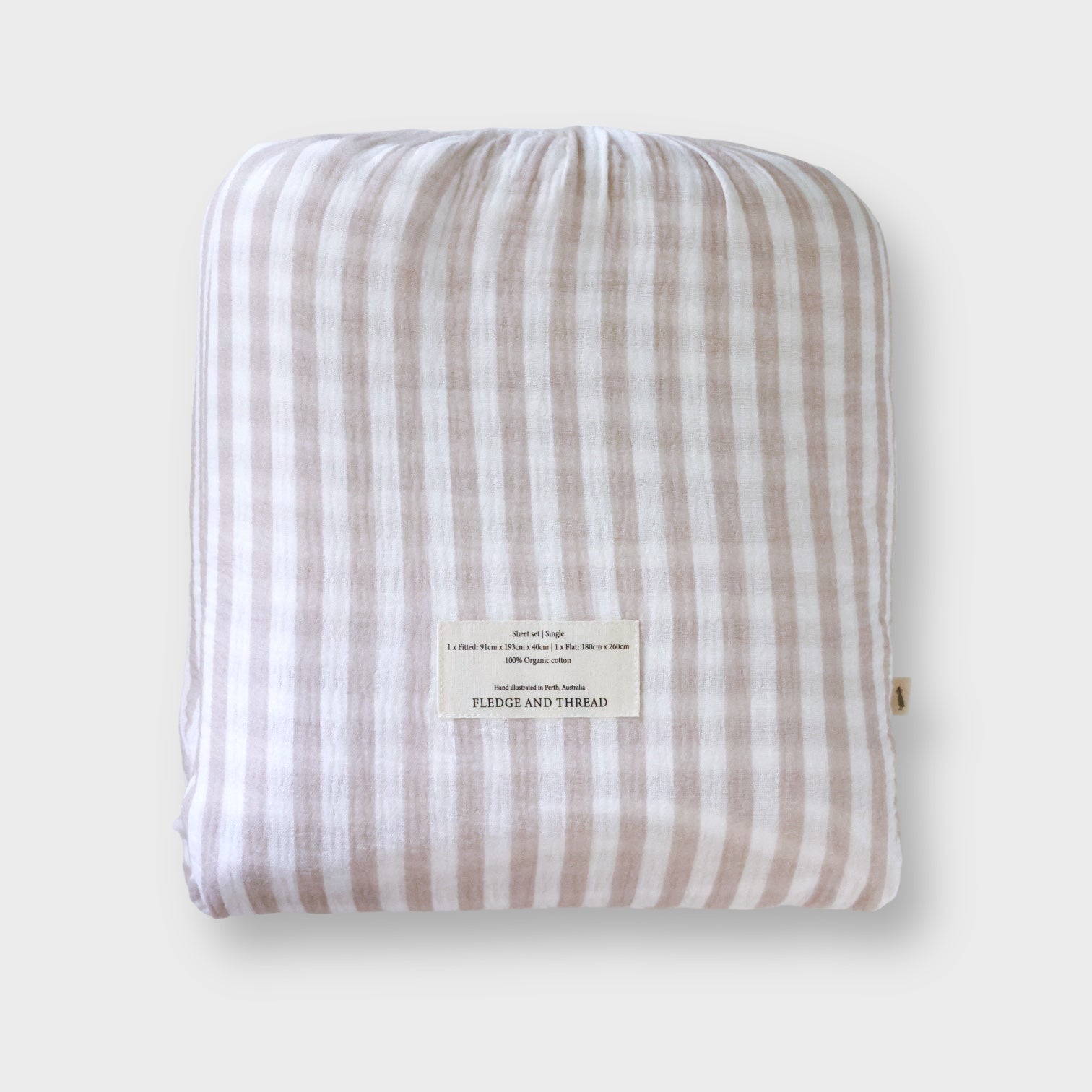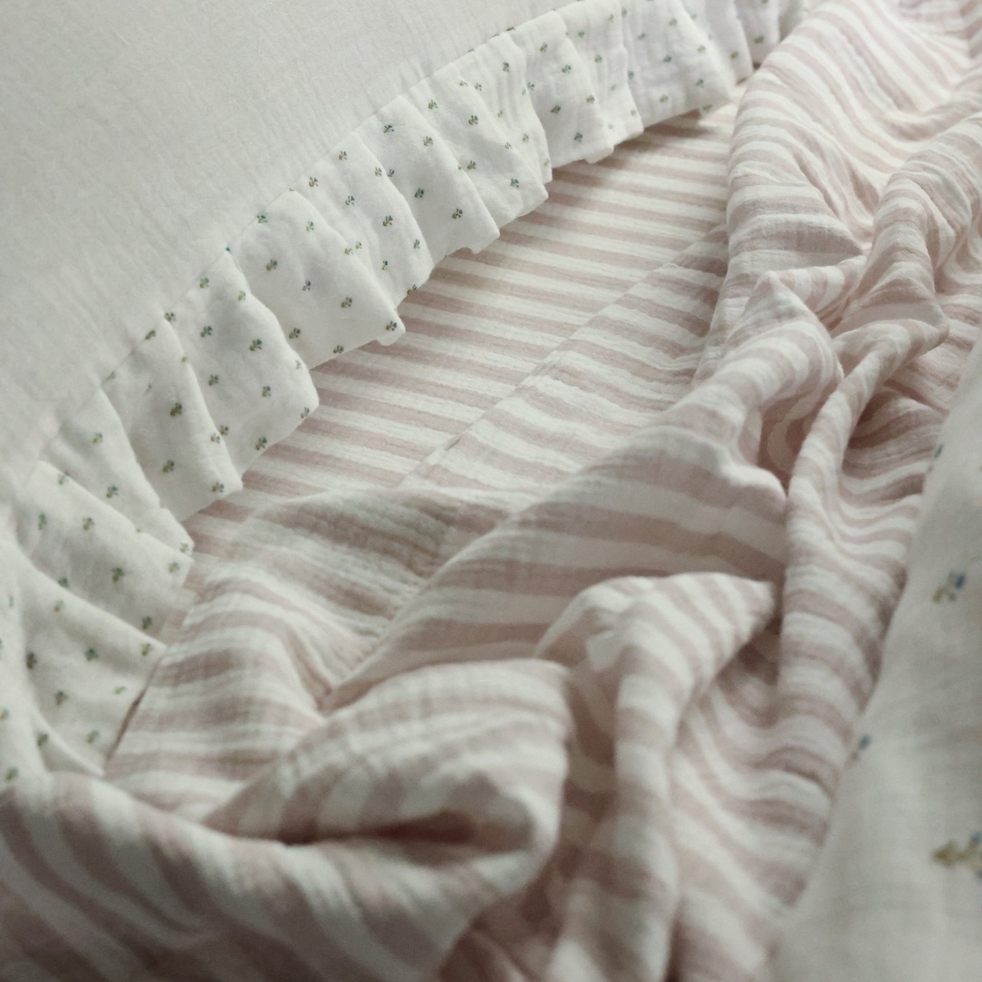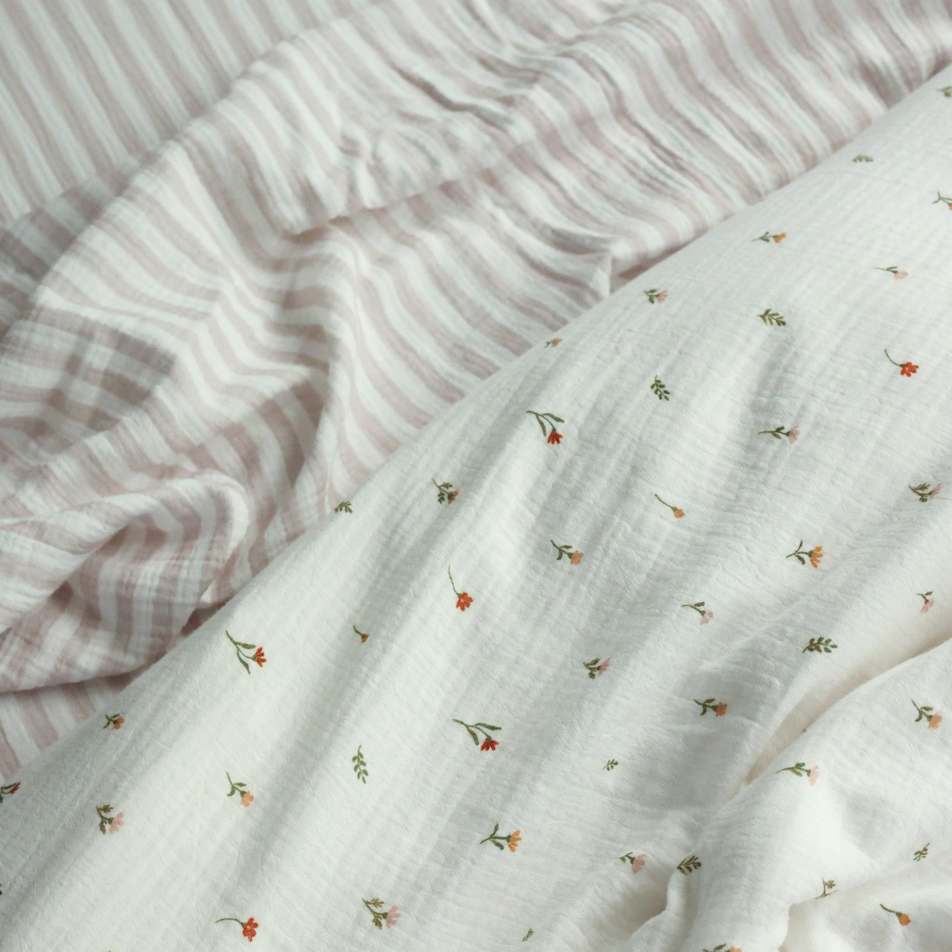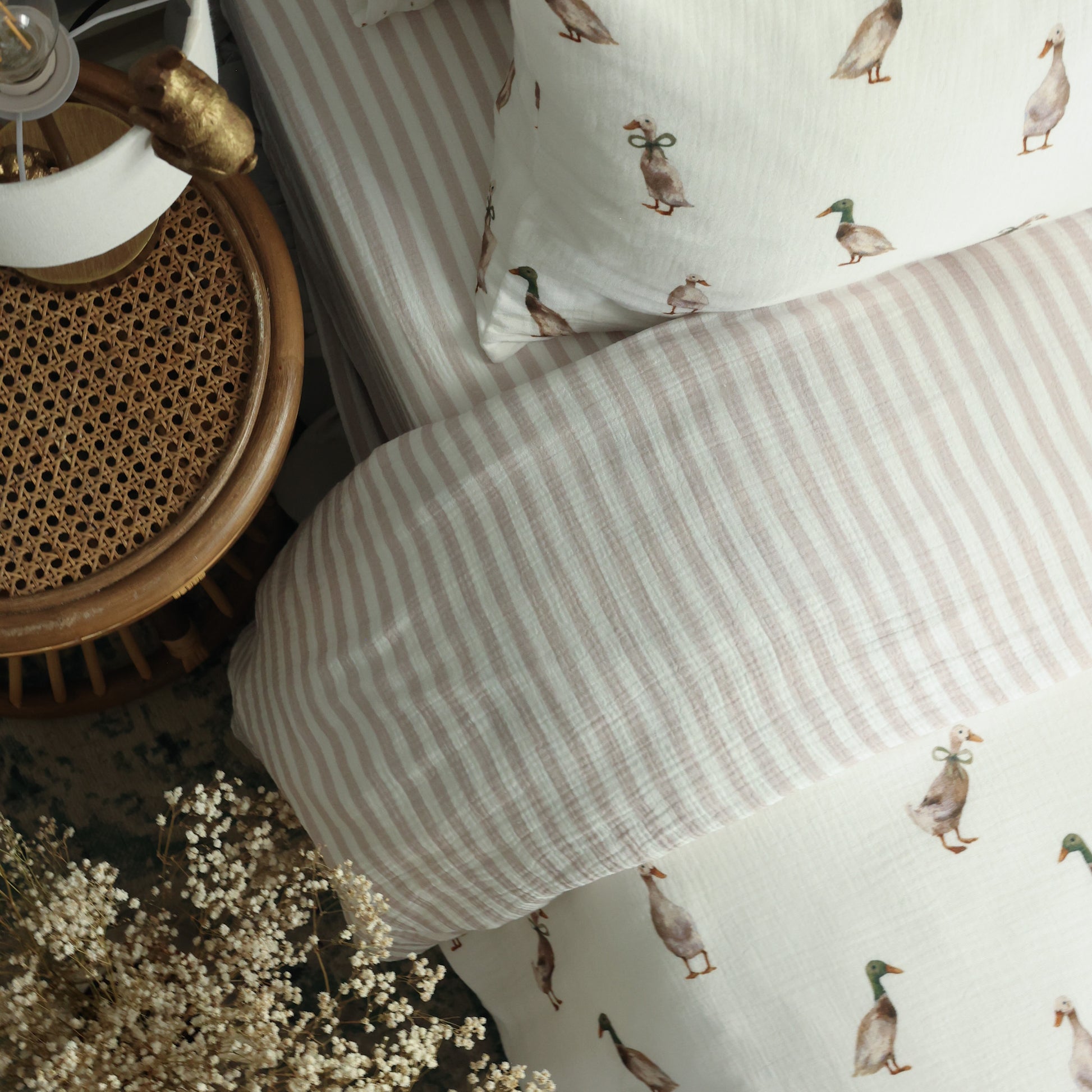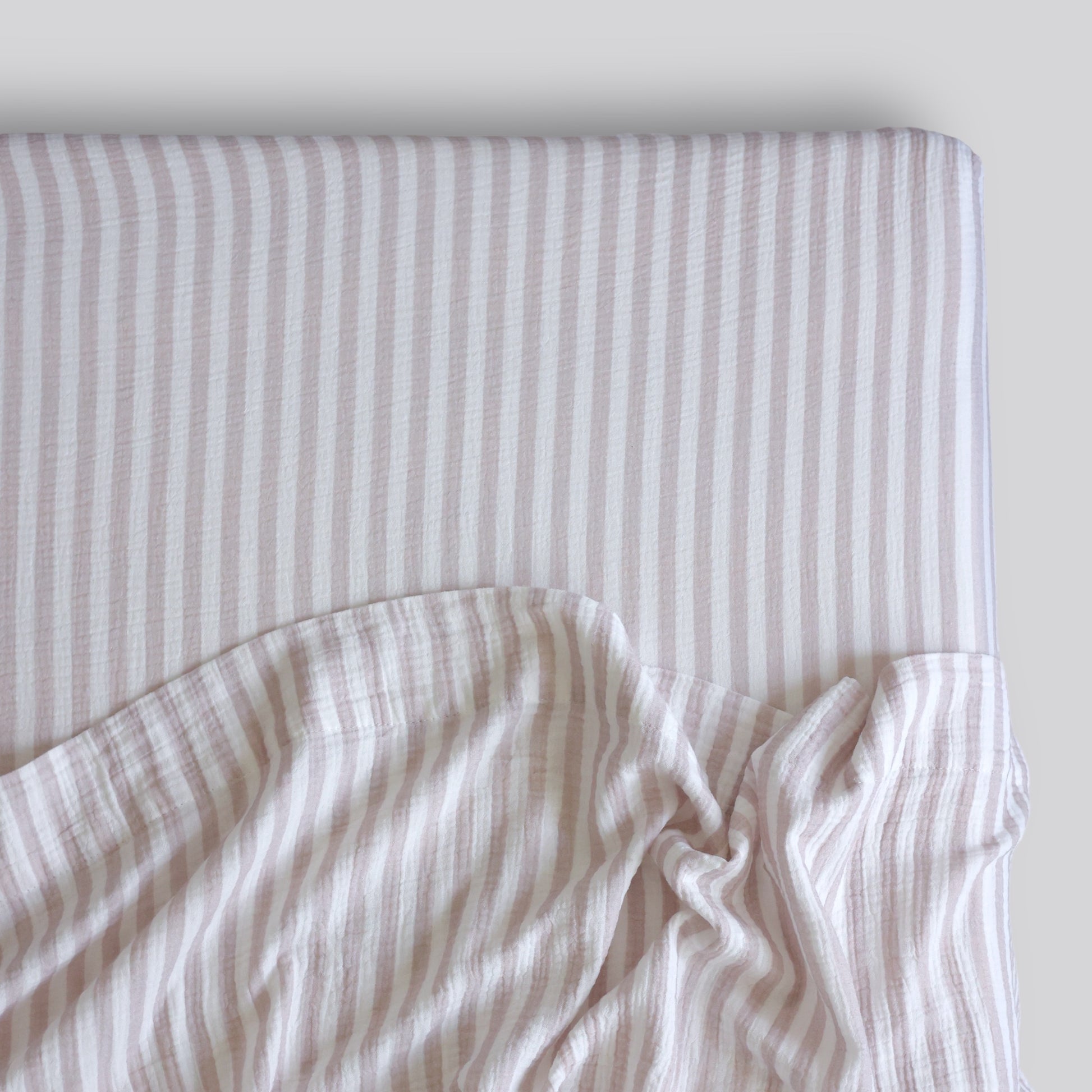 Our sheet sets include a single fitted sheet and a single flat sheet, crafted from 100% crinkle muslin with a pink stripe design.